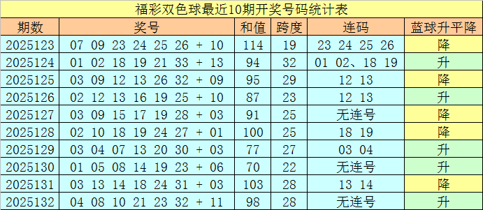 上期开奖:福彩双色球第2025132奖号开出:04 08 10 21 23 32 + 11,红球号码和值为98,首尾间距为28,无连号。