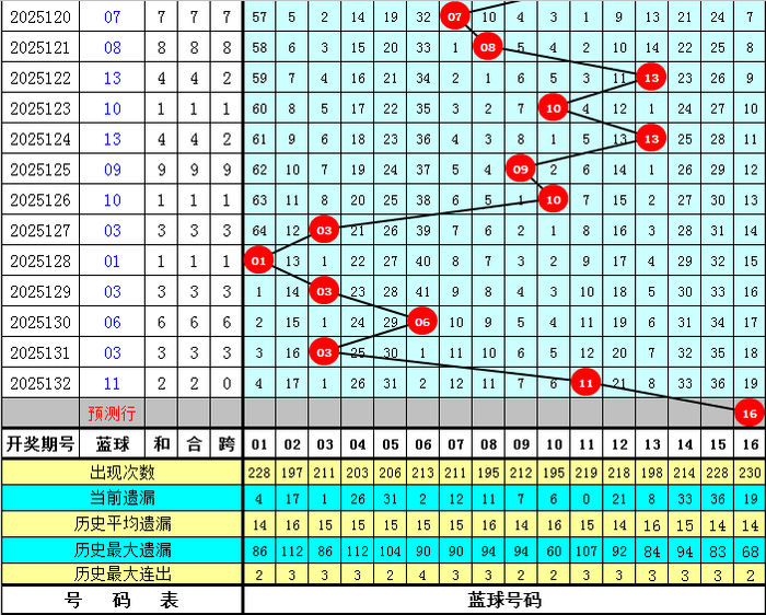 蓝球分析:上期蓝球开出号码11,上升8个点位,最近10期蓝球号码升平降分别为:降、升、降、升、降、降、升、升、降、升,本期防蓝球号码上升,一码蓝球关注16。