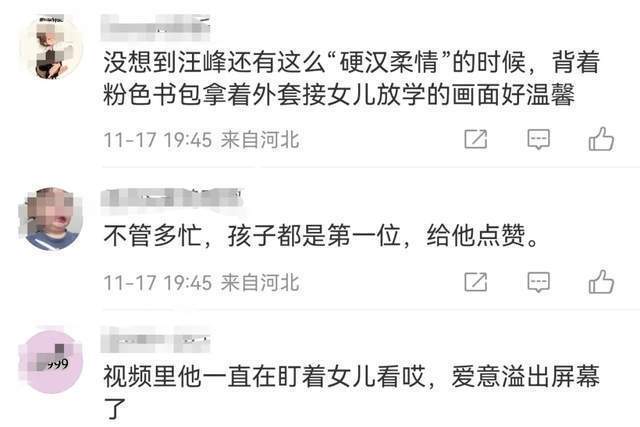 有网友表示:没想到汪峰还有这么“硬汉柔情”的时候,背着粉色书包,拿着外套接女儿放学的画面好温馨!愿意为女儿付出,这就是汪峰的加分项。