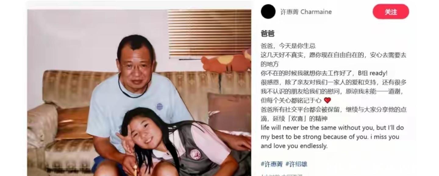 除了亲临现场的艺人,成龙、周润发夫妇、刘德华、吴彦祖、古天乐等众多明星也纷纷送上了悼念花牌。整个灵堂被这些承载着深情的花牌环绕,无声地诉说着许绍雄在圈内极好的人缘。许绍雄的女儿许惠菁在灵堂外接受了采访。她坦言,对爸爸的离世感到突然和不真实。回忆起爸爸曾说在拍《新扎师兄》时,一个月内经历父母和姐夫先后离去,却没麻烦任何同事,也没停工,她表示会向爸爸学习,照顾好家人。当被问及是否有遗憾时,许惠菁眼中闪烁着泪光:“这个的确很遗憾,爸爸负责任又有爱,照顾我很多年,好遗憾不够时间孝顺爸爸,也没能让他抱上孙子。”她还透露,不会关闭爸爸的社交平台,仿佛这样爸爸就还在大家身边。11月18日上午11时,大殓仪式以佛教形式举行。之后,灵柩于中午移往富山火葬场火化。黄子华、张家辉等挚友在灵堂守候逾一小时,他们的眼神中满是不舍,仿佛还想和这位老友再多待一会儿,再多聊聊天。