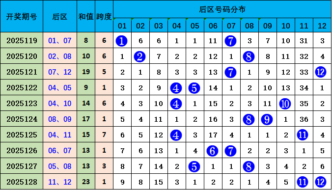 后区走势分析:上期开出号码11 12,近10期跨度是:6、6、5、1、6、1、7、1、3、1,本期预计跨度上升,推荐号码05 07,跨度2。