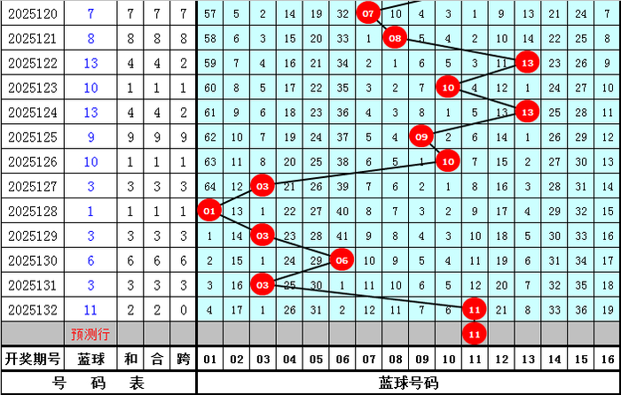 蓝球分析:去年第133期蓝球奖号为01,开出1路蓝球,目前2路蓝球轮空7年,今年同期适当关注2路蓝球回补,看好号码11。