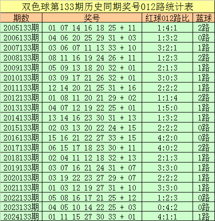 福彩双色球第2025133期历史同期王守礼012路奖号遗漏分析: