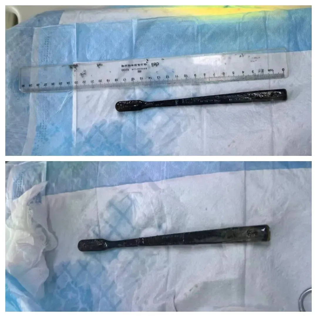经过系列检查和术前准备,10月27日为张先生进行了手术,医生徐涛成功为其取出一把牙刷,本以为手术结束了。然而更令人意外的是,影像资料却显示——胃里还有另一把!